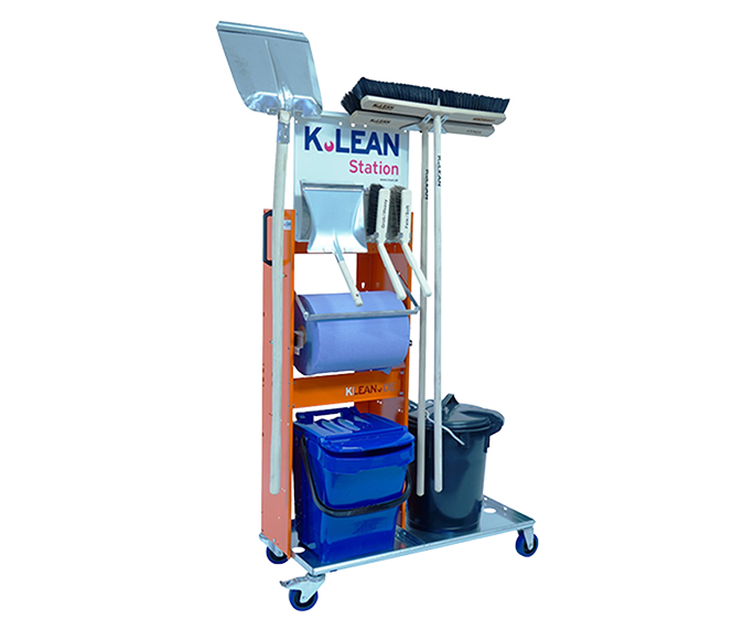 Diese fahrbare Reinigungsstation bietet Platz für 4 Reinigungsgeräte, eine Putzrolle mit Abreißschiene und 2 Mülleimer: